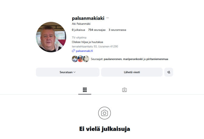 Tilillä on 754 seuraajaa ja seurannassa kolme tiliä. Esittelyssä mainitaan tv-ohjelma, mukana on tuttu lause ”Olekee hiljaa ja huutakaa”, ja lisäksi profiilissa näkyvät Uuraisten osoitetiedot sekä verkkosivu palsanmaki.fi.