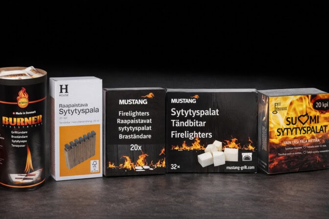 Otimme testaukseen kaksi raapaistavaa sytytyspalaa ja kaksi muuta: toinen niistä on pakattu pieniin annospusseihin ja toinen on vapaasti katkottavaa ”sytytyslevyä”. Viides oli hybridimalli, jossa oli sekä ”sytytyslanka” että -pala yhdistettynä.