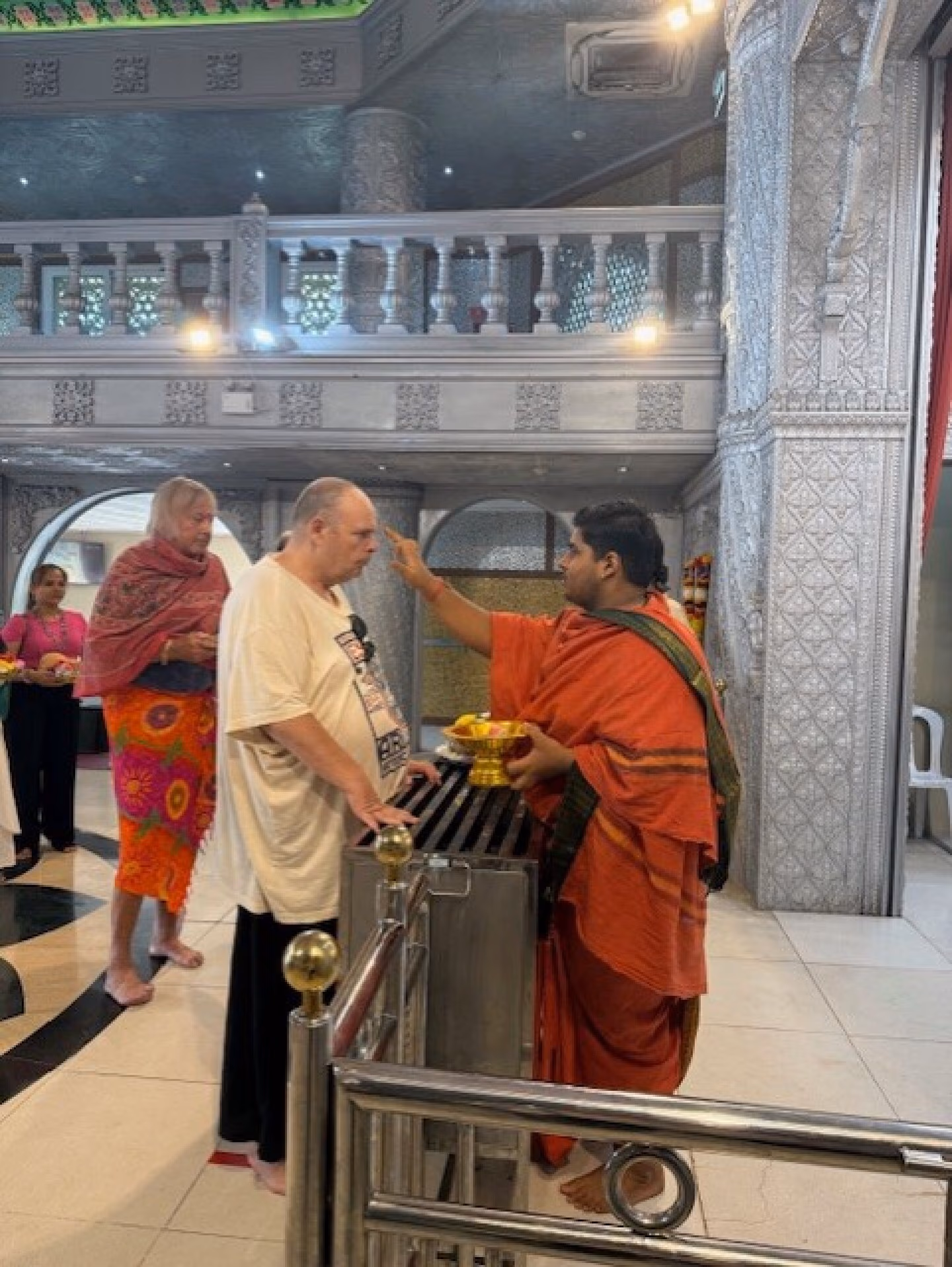 Temppeleissä on syytä peittää olkapäät ja niissä ei asioida sortseissa. Dannylla on kaiketi ollut sortsit ja hihaton paita.