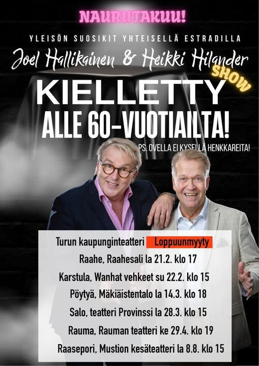 Ja nyt hän yllättää. Hän tekee kiertueen toisen turkulaisen jantterin, koomikko Heikki Hilanderin kanssa. He järjestävät Iloisen iltapäivän, joka on kuulemma alle 60-vuotiailta kielletty.