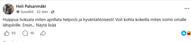 Heli Palsanmäki julkaisi tänään somessa kirjoituksen. Se oli tämänkaltainen: