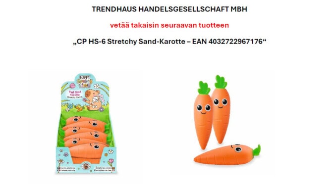 XS Lelut ilmoittaa takaisinvedosta. Se koskee Suomen XS Lelut -myymälöissä myytyä stressilelua, joka näyttää porkkanalta ja venyy.