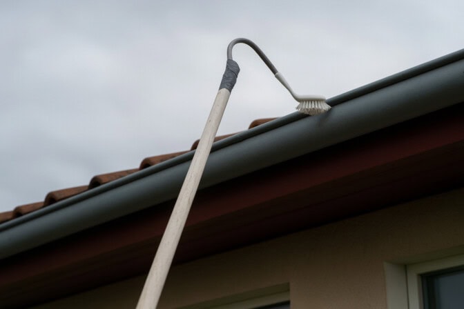 -Rännien puhdistusvälineen saat teipistä, harjanvarresta, kipukoukusta tai muusta koukusta ja tiskiharjasta. Toimii kuin junan vessa! niksaaja kehittelee.