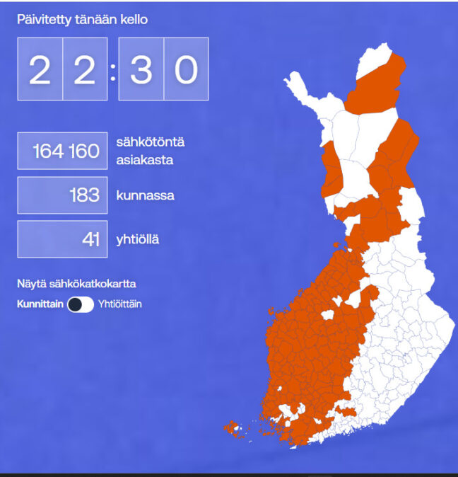Tilanne elää ja kello 22.30. on jo yli 164 000 sähkötöntä taloutta.